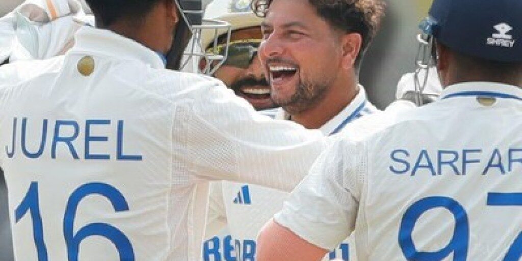 Kuldeep Yadav celebrates wicket with Sarfaraz Khan and Dhruv Jurel. Photo: Sportzpics for WPL2 min read Last Updated : Sep 25 2024 | 8:41 AM IST