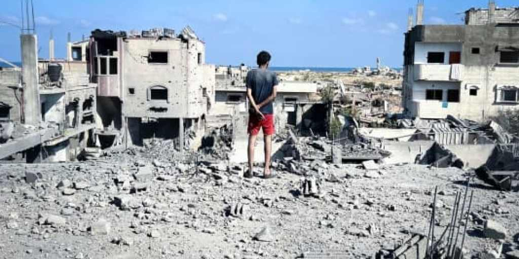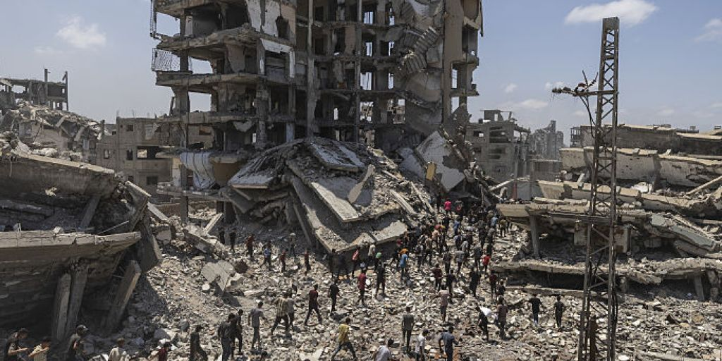 Palestinians walking amongst ruins in Gaza City ahead of Israel's approval of a new war strategy that will see the occupation of the entire territory, Aug. 7. Credit -...