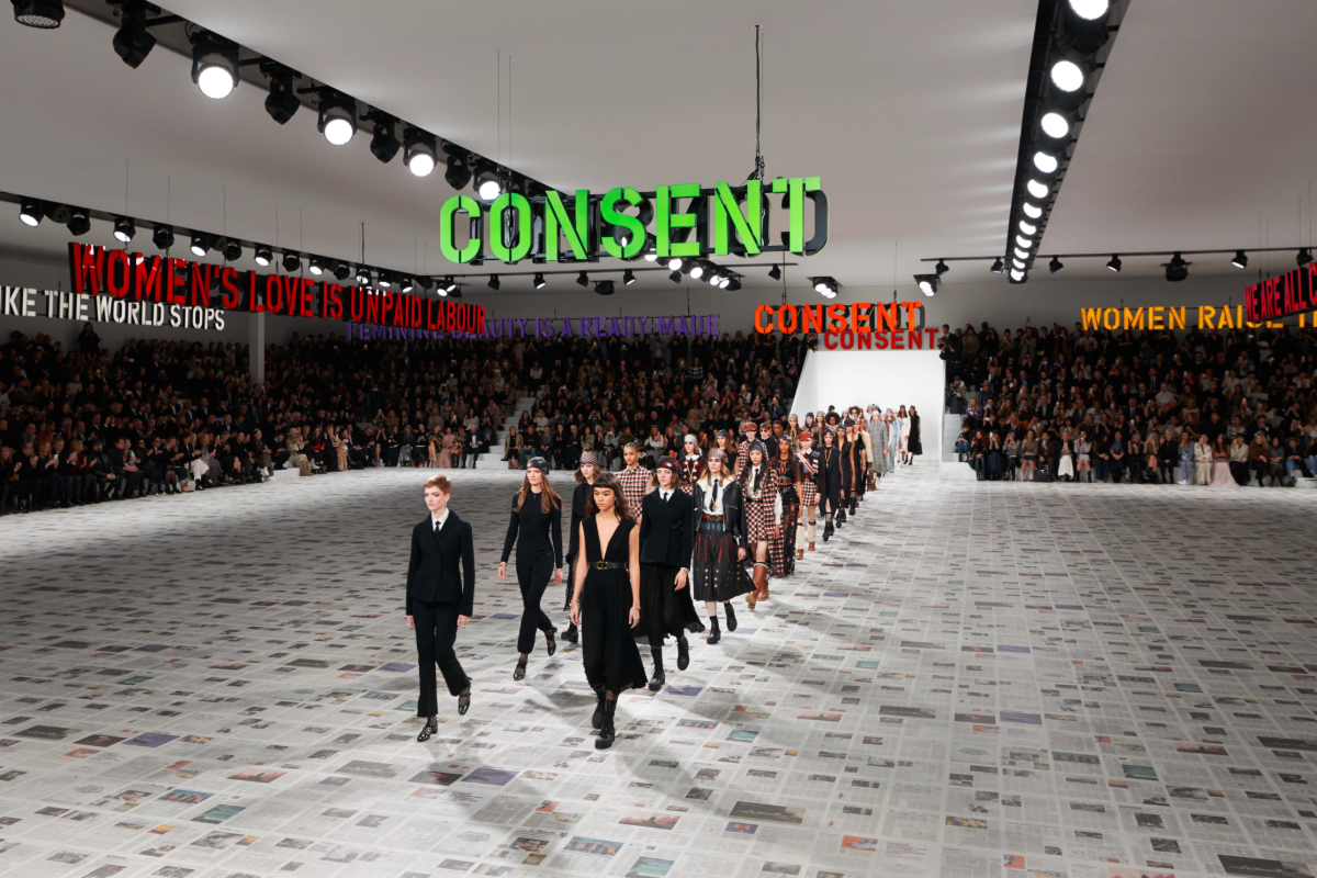 For him, the clincher was the fall 2020 show with a set by art collective Claire Fontaine featuring three neon signs suspended from the ceiling flashing the word “consent.” It took place the day after Harvey Weinstein, the film producer who crystallized the #metoo movement, was convicted in court of rape.